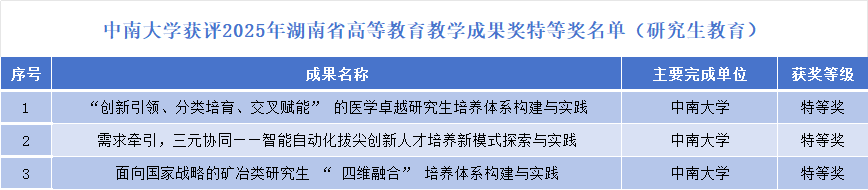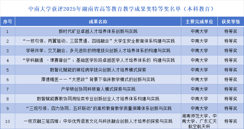 本网讯 日前,湖南省教育厅公布了2025年高等教育教学成果奖获奖成果名单。中南大学共获得教学成果奖成果57项,其中作为牵头单位获特等奖12项、一等奖23项、二等奖20项;以参与单位获特等奖1项、二等奖1项。