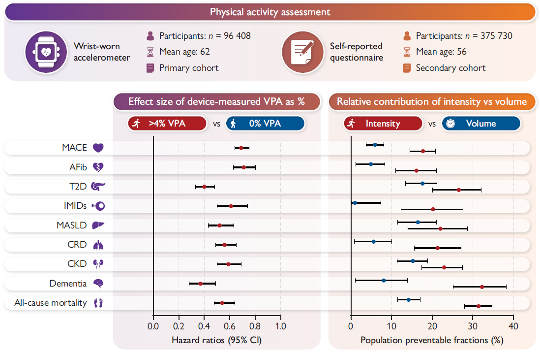 3月30日,湘雅医院陈翔教授团队在国际权威期刊《欧洲心脏杂志》(European Heart Journal)发表了题为《身体活动量和强度与心血管和非心血管慢病风险》(Volume vs intensity of physical activity and risk of cardiovascular and non-cardiovascular chronic diseases)的国际合作研究论文。该研究率先揭示,在预防多种慢性病时,运动的“强度”远比“总量”更为关键。这一发现为慢性病的异病同治提供了非药物干预思路。陈翔教授和湘雅公共卫生学院沈敏学教授为论文的通讯作者,湘雅公共卫生学院韦杰桦博士为论文的第一作者。此外,来自悉尼大学、哈佛大学等全球多所高校的学者共同参与了该项研究。