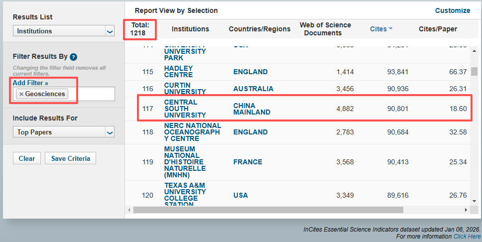 我校地球科学ESI学科全球排位情况