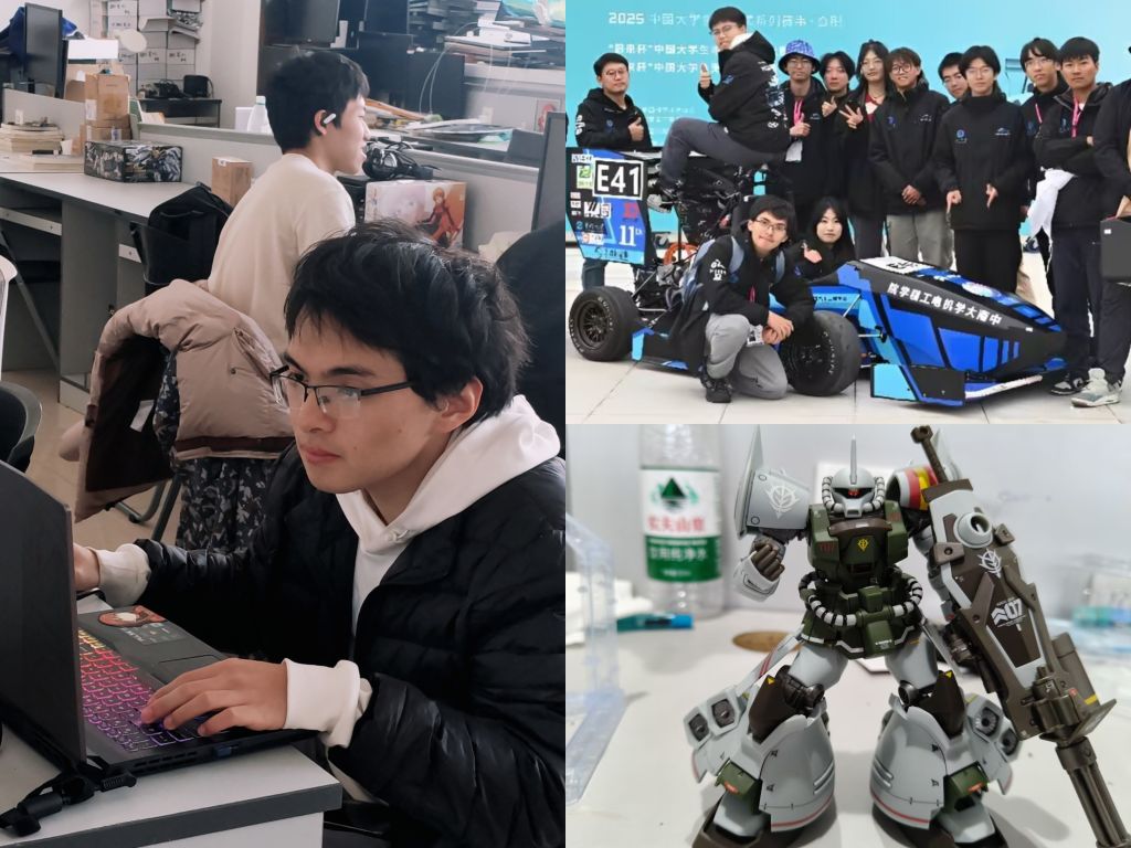 对他而言,“好玩”是许多事情开始的理由,也是求知欲被激发的起点。少年时看《机动战士高达》,那些机甲又酷又帅的形象,在他心里埋下了种子,促使他选择了机械设计制造及其自动化专业。从前只在动画中见过的机械,如今一个个从他手中诞生——在中国机器人及人工智能大赛上,他和伙伴为格斗机器人设计武器;在方程式车队里,他熬过好几个通宵,想出用直流电机替代步进电机的办法,解决车轮扭矩不足的问题。这份钻研的耐心,也是在拼模型中渐渐锻炼出来的。
