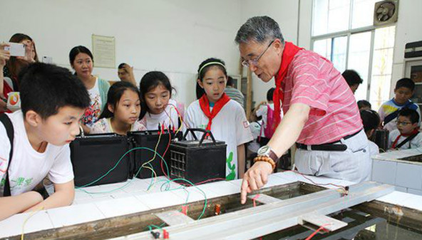 上午9时,年逾八旬的何院士在报告厅里通过幻灯片向小学生们讲述地理知识,什么是地震?怎样预防地震?如何探寻宝物的藏身之处……在场的小学生们听得十分入迷,连连惊叹,不停地向何院士发问:“何爷爷,你的双频激电法是怎么想到的?”何院士微微一笑,用比喻作答:“你们现在在这堵墙前面画一根线,等明年你们又到这里,再画一根线,两根线的高度差,不就是你们一年来长高了多少?其实双频激电法也是一样的,给它定一个初始的标准,然后再测定他们的变化,看看它是在哪里极化了,这就是双频激电法的原理了。”