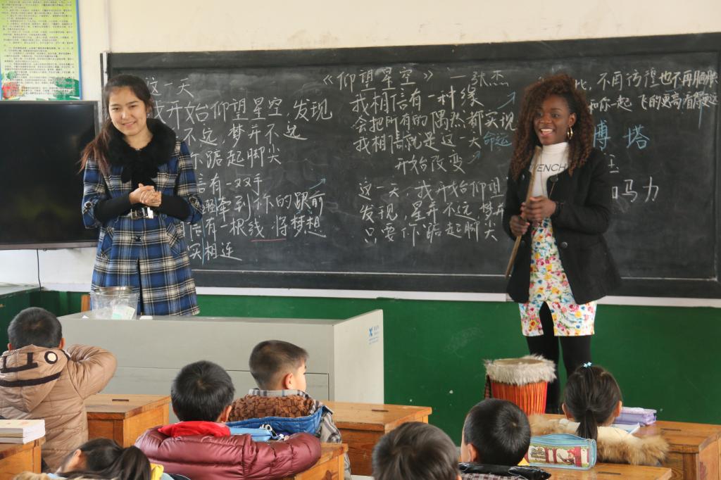 上课铃敲响,支教的留学生根据事先的分组来到不同的班级。吉达斯给六年级的同学上了一堂初级法语课,新奇的发音和单词引得学生争相模仿。朵拉在四年级的教室里跳起了非洲舞蹈,夸张的舞蹈动作既活力无限,也趣味无穷。在老师的鼓励下,几名孩子勇敢地站在了讲台上,跟着留学生学习动作。二年级的教室里,马莎向小朋友们教学非洲鼓乐。简单的鼓点节奏点燃了大家跃跃欲试的热情。