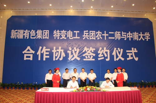 6月21日上午,学校与新疆有色集团、新疆特变电工集团有限公司、新疆生产建设兵团农十二师全面合作协议签字仪式在新疆迎宾馆隆重举行。仪式由自治区国资委党委副书记、主任张继勋主持,自治区党委常委尔肯江·吐拉洪出席仪式并讲话。根据合作协议,我校与新疆有色集团共同成立“中南大学新疆研究院”,新疆有色集团将在五年内出资3000万元在学校设立“新疆有色集团-中南大学研究基金”,用于学校组织科研技术力量到新疆有色集团现场考察、学术交流并在研究院开展有关项目的研究。学校将分别与新疆特变电工众和股份有限公司、兵团农十二师在科学研究、人才培养等方面开展全面合作。