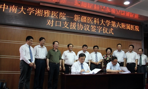21日下午,校领导分别赴有关单位参观、座谈、交流。高文兵书记、徐建军副书记、陶立坚副书记及学校办公室、本科生院、研究生院招生办、学工部、湘雅医院等部门和单位负责人来到新疆医科大学召开座谈会。新疆医科大学党委书记李斌回顾总结了2005年以来中南大学对口支援新疆医科大学的工作情况,双方就进一步推进对口支援工作进行了交流和探讨,并现场办公落实了有关具体事项。会上,我校湘雅医院与新疆医科大学第六附属医院签署了合作协议。