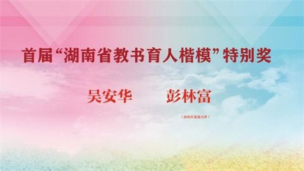 首届“湖南省教书育人楷模”发布暨宣传启动仪式上,省教育厅党组成员、省委教育工委副书记王建华公布了2020年“湖南教书育人楷模”推选结果。其中,中南大学湘雅医院教授吴安华,衡阳市常宁市塔山瑶族乡中心小学教师彭林富2人获“湖南省教书育人楷模”特别奖, 邵东市第一中学申玢彦、湖南农业大学刘仲华、湘潭大学李佑新、龙山县石牌镇初级中学张光柱、临湘市第二中学陈奇志、新化县琅塘镇苏溪湖实验中学陈腊梅、石门县罗坪乡栗子坪教学点卓德刚、湖南第一师范学院周小李、长沙民政职业技术学院黄有全、张家界旅游学校龚美慧10人获“湖南省教书育人楷模”称号,怀化市第三中学田建龙、湖南师范大学汤素兰、南县第一中学牟金春、湖南大学何人可、永州职业技术学院张琼宇、省政府机关第二幼儿园陈雯、中南大学柴立元、长沙市芙蓉区育英学校郭晓芳、醴陵市第二中学唐新秋、湘潭市岳塘区滴水湖学校曹峰、郴州市宜章县迎春镇学校彭国良、永州市工商职业中等专业学校魏华12人获“湖南省教书育人楷模”提名奖(以上排名均按姓氏笔画为序)。